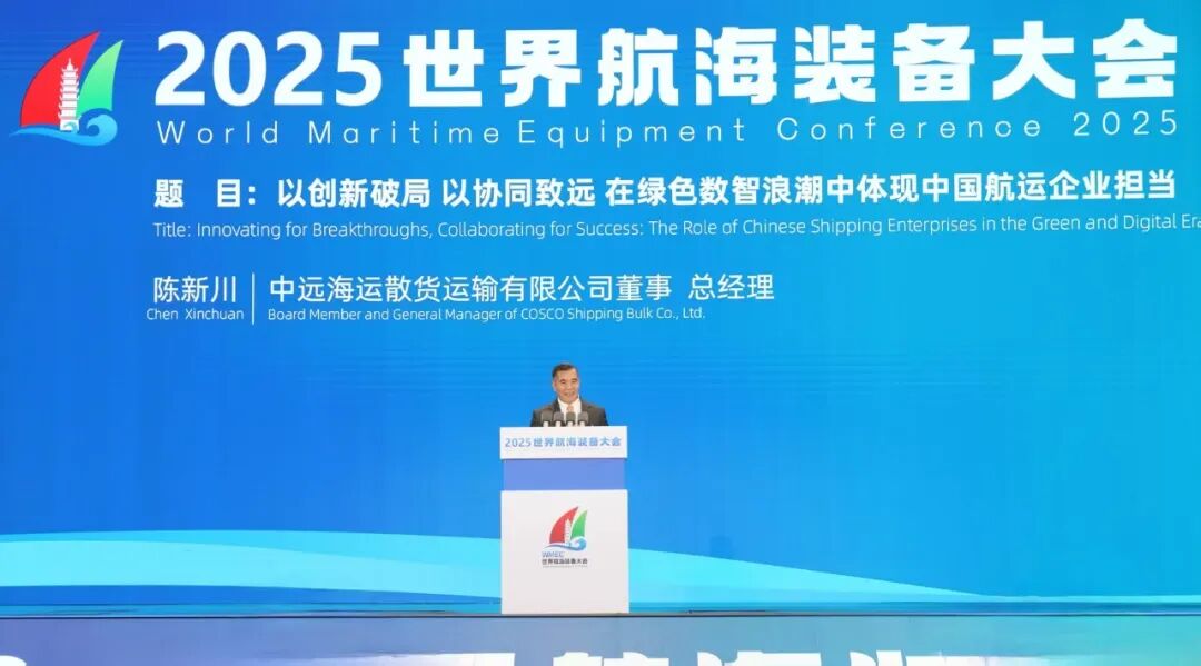 在世界航海装备大会主论坛上,陈新川发表了题为《以创新破局 以协同致远 在绿色数智浪潮中体现中国航运企业担当》的演讲,主要围绕中远海运散运锚定绿色转型,以长期主义探索新能源未来;探索数智赋能,构建航运智慧网络;守护动力基石,以装备升级守护供应链安全等三个核心观点展开,展现了中远海运散运在绿色动力转型方面的信心和决心,传递出中远海运散运愿与全球伙伴携手共建开放、协作、共赢的产业生态的坚定意愿。